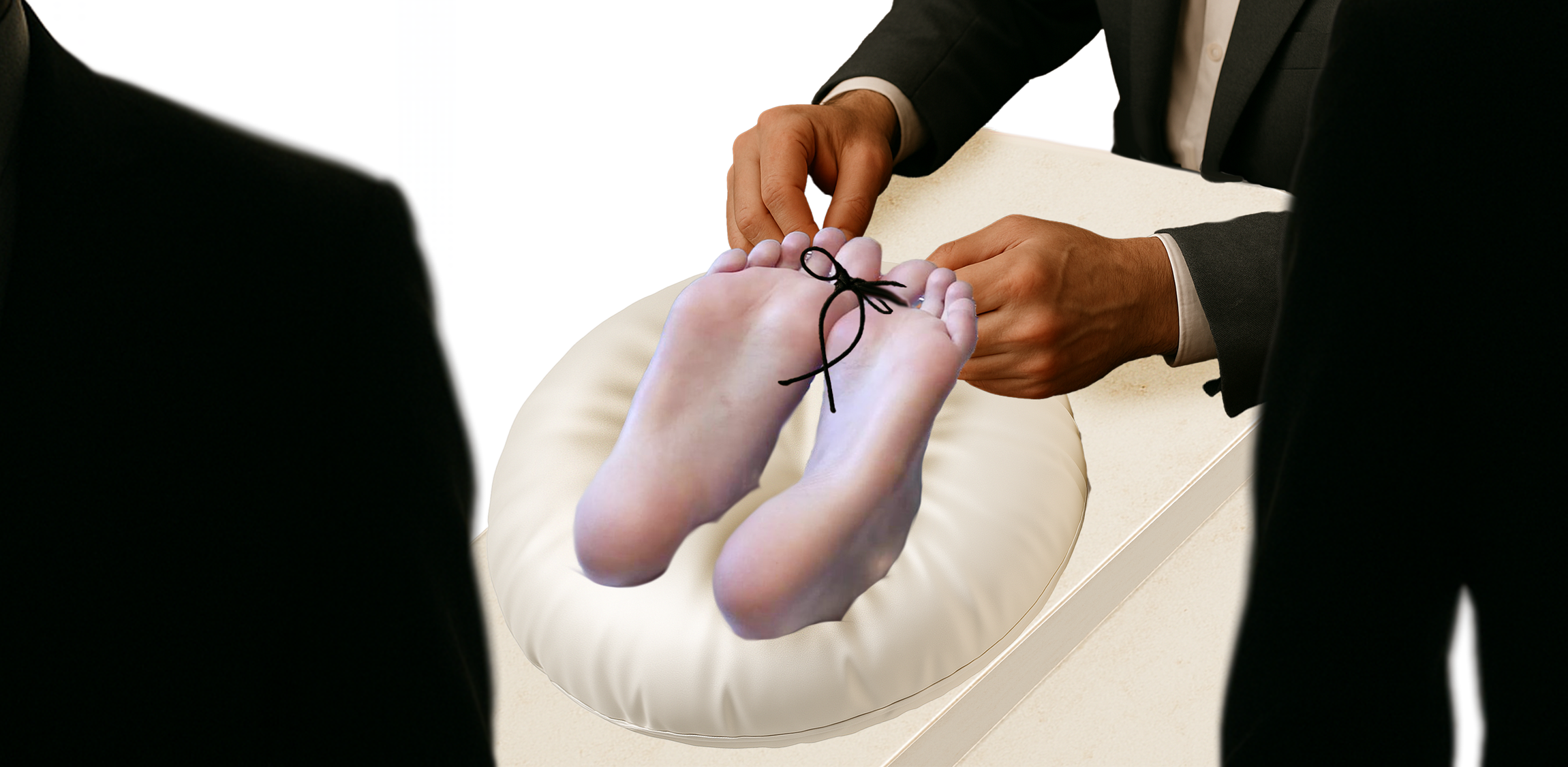 Miller dove in, threading string back between Tim’s already-bound toes, tugging it tight, sawing it back and forth with manic rhythm, always taking a dedicated focus to each index toe …