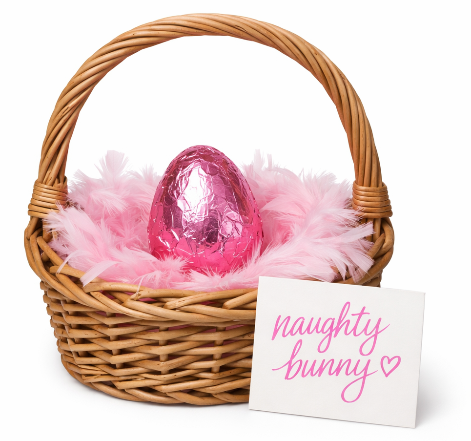Inside the basket lay a large chocolate Easter egg wrapped in shiny pink foil, nestled among soft pink feathers. A small cream-colored note was tucked beside it.