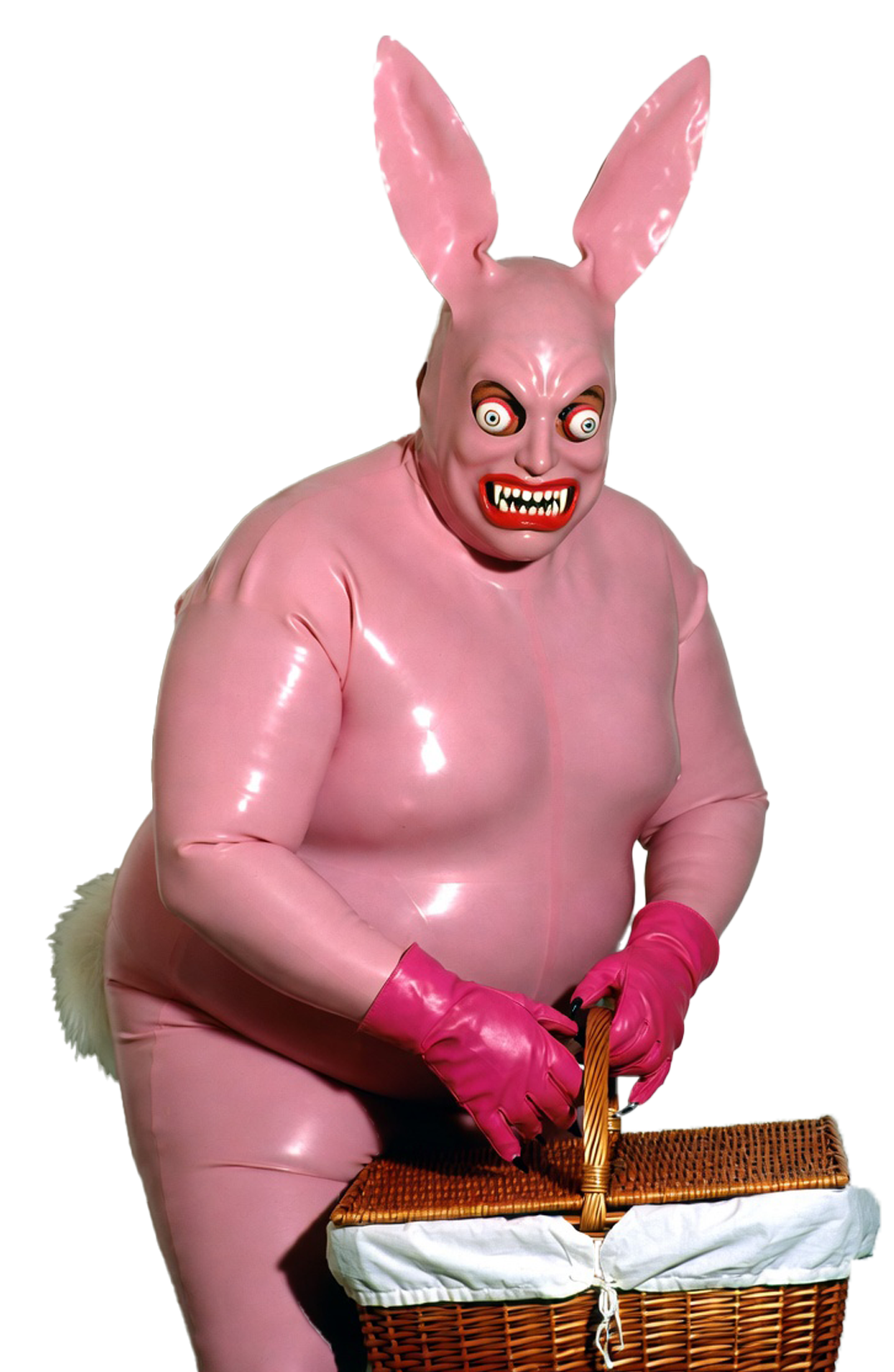 From head to toe, he was encased in shiny pink latex that clung to every contour of his body like a second skin. The suit was zipped all the way up to his neck, gleaming under the light with an unnatural, almost wet sheen. A smooth, manic-expression bunny mask covered his face and tall upright ears sprung from his head, casting long, distorted shadows against the plastic sheets behind him. His eyes were cartoonish and bulging, his lips pink, teeth sharp. His hands were gloved glossy, darker pink latex, but the fingertips ended in sharp black claws that looked far too realistic for comfort. The whole ensemble should have looked ridiculous. Instead, it was deeply, inexplicably weird.