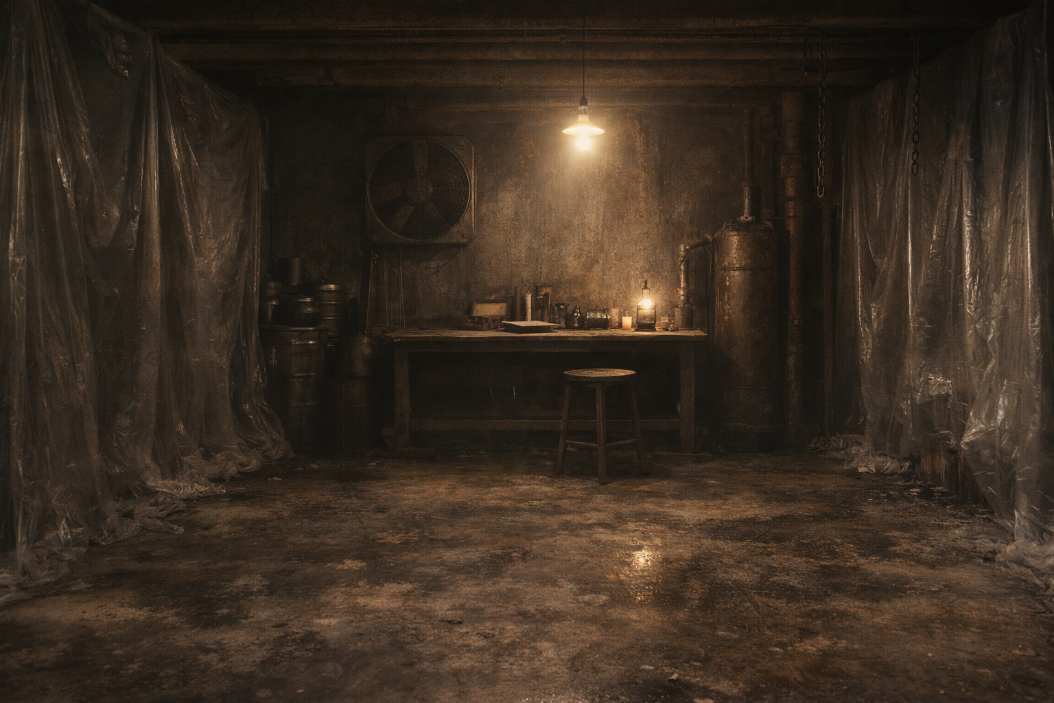 The Bunny didn’t flinch. He didn’t even tilt his head. The mask remained perfectly still, those silly blue eyes reflecting the spotlight as he simply walked closer with calm, deliberate steps, the latex creaking softly with each movement. Without a word, he parked himself in front of Mason’s protruding feet and set the basket down on the plastic-covered floor.