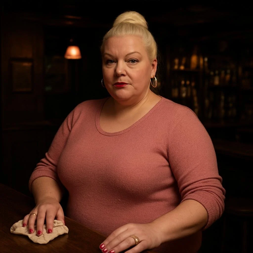 Behind the bar stood a woman in her fifties, platinum blonde hair pulled into a tight bun that looked like it had been redone several times that day - her sweater sleeves were rolled, her hands steady as she wiped the counter - when she looked up, her gaze landed on Oscar and stayed there.