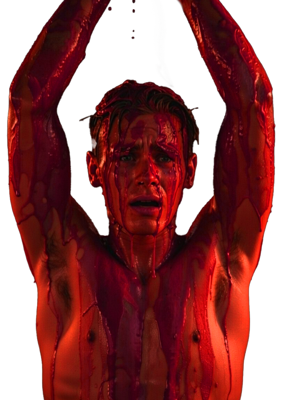 Blood coated him head to toe, soaking his hair, dripping from his lashes, running in rivulets down his chest and legs.