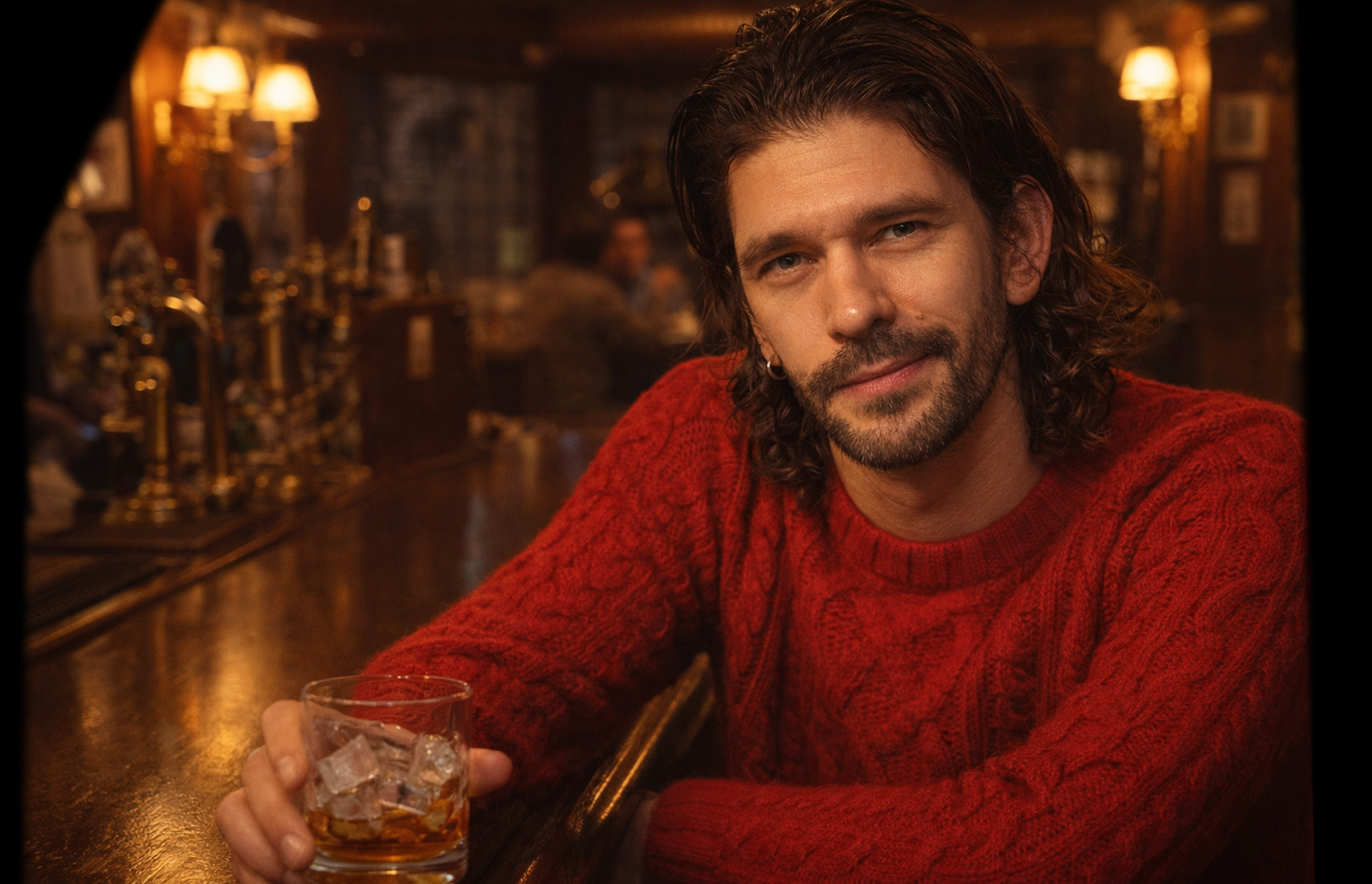 He was good-looking in a quiet, unshowy way; jaw length dark hair pushed back from his face, a short beard that suited yet softened him. Besides the kind of features that drew your eye without demanding it, what mostly stood out was the ease of him, the confidence to take the stool beside Oscar without asking, to speak as though the space between them already belonged to him, as though Oscar’s arrival had simply given him a reason to move.